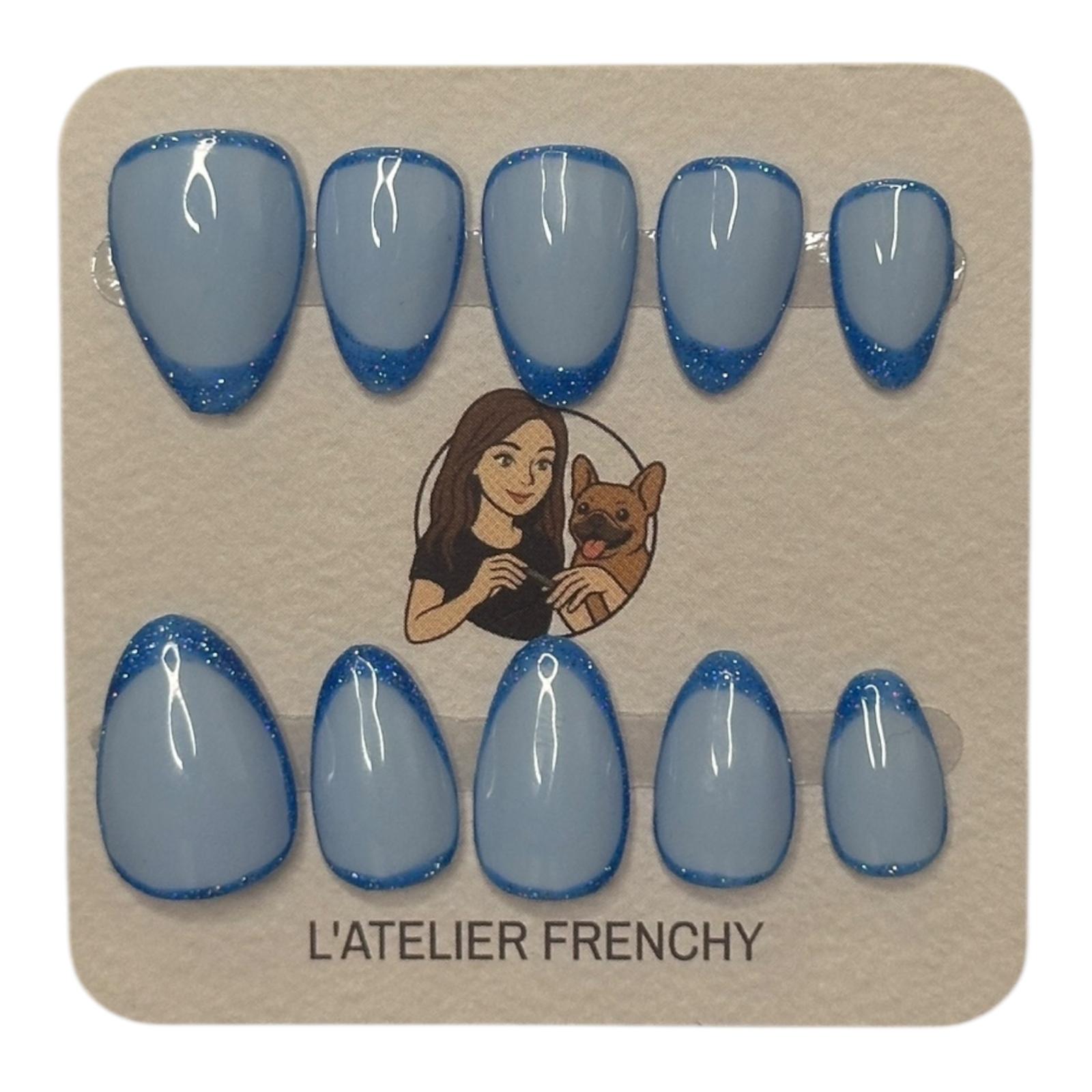 Un bleu pastel doux bordé d’un liseré bleu roi scintillant, pour un effet frais et élégant.